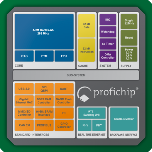 Additionally, a unique feature of this SoC is the high-speed backplane-communication-master for profichip SliceBus Technology. It provides fast and reliable communication for up to 64 of profichip SNAP+ slave controllers.